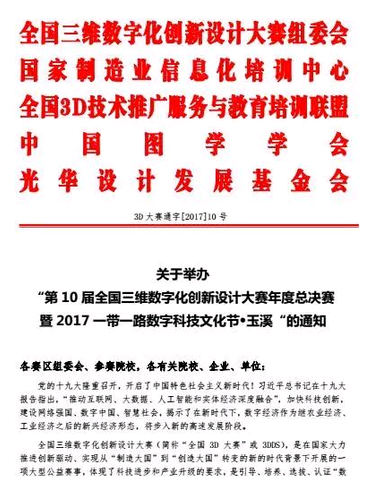 查看更多“數造杯”數字化創意設計與智能制造(3D打?。┐筚惉F場總決賽作為第十屆全國3D大賽重要賽事之一,已經進入倒計時階段啦!國務院參事石定寰將出席全國3D大賽總決賽!趙沁平院士將出席全國3D大賽總決賽!