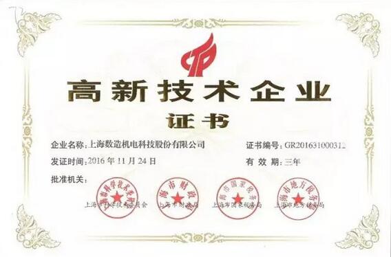 2017年2月7日,上海數(shù)造機電科技股份有限公司收到了由上海市科學(xué)技術(shù)委員會、上海市財政局、上海市國家稅務(wù)局、上海市地方稅務(wù)局聯(lián)合頒發(fā)的“高新技術(shù)企業(yè)”認(rèn)定證書,正式邁入國家高新技術(shù)企業(yè)行業(yè)。